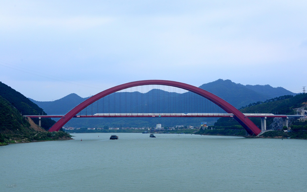 主跨450m的南廣鐵路西江特大橋是世界上最大跨度的高速鐵路鋼箱拱橋,設計中對“邊段豎轉+中段提升”、“纜索吊機節段懸拼”總體施工方案進行了研究,結合“前臨西江,后靠陡峭山坡”的基礎工程特點提出了可承擔巨大水平力的新型基礎結構形式和計算分析方法,解決了大跨度拱橋溫度變形大帶來的軌道鋪設精調和高速動車組運營性能評判的技術難題,總體技術成果達到國際領先水平,獲國家發明專利,2016年榮獲“中國鋼結構工程大獎”。
