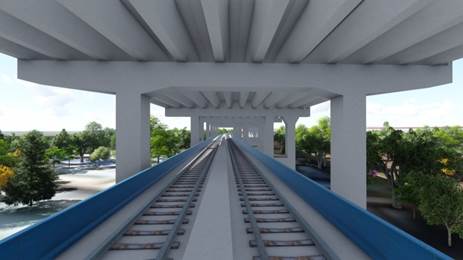 中鐵咨詢承擔了天堂河~磁各莊站(不含)區(qū)間設(shè)計工作,包括地下、路基、高架工程。其中高架區(qū)間包含長度7.9km的公鐵共構(gòu)段,將新機場高速和新機場快軌構(gòu)建在同一高架橋上,新機場線位于中橫梁上,高速公路位于上橫梁上,地面為規(guī)劃團河路,形成三層立體交通走廊。這是北京市首次采用共構(gòu)方式與新機場高速共廊建設(shè),在國內(nèi)城市軌道交通和高速公路建設(shè)領(lǐng)域極為罕見。
