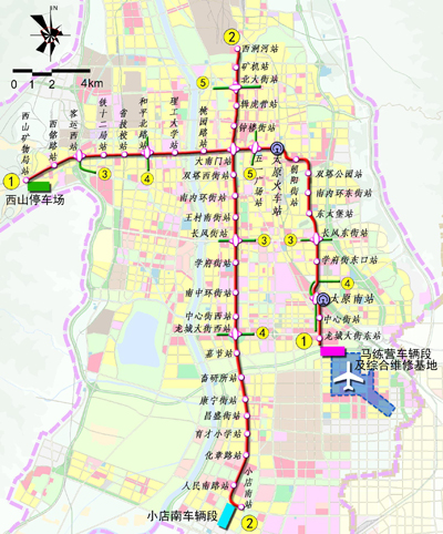 太原市軌道交通1號(hào)線一期工程起于西山礦務(wù)局,終于龍城大街東站,于太原市內(nèi)呈倒“L”形分布,東西向沿迎澤大街,途經(jīng)客運(yùn)西站、理工大學(xué)、大南門、柳巷、五一廣場、太原站等客流集中點(diǎn),南北向沿朝陽街、太行路、馬練營路敷設(shè),途經(jīng)朝陽街服裝城、雙塔公園、東太堡、太原南站綜合交通樞紐等地。1號(hào)線一期工程是聯(lián)系迎澤、武宿兩個(gè)市級(jí)中心和太原站、太原南站兩個(gè)鐵路交通樞紐的骨干線路,線路全長約24.07km,設(shè)橋梁1座,長約0.215km,其余全為地下線;共設(shè)置車站21座,全部為地下站,在線路西端設(shè)西山礦務(wù)局停車場1座、南端設(shè)馬練營車輛段及綜合維修基地1座,全線網(wǎng)共享控制中心1個(gè)。太原市軌道交通1號(hào)線于2010年完成工程可行性研究報(bào)告初稿,擬采用6輛編組的B型車、1500V接觸網(wǎng)供電,估算總投資157.9億元,計(jì)劃2013年開工建設(shè),2017年建成通車。1號(hào)線是太原市先期啟動(dòng)建設(shè)的軌道交通線路之一,是一條客流需求和規(guī)劃引導(dǎo)兼顧的大運(yùn)量線路,在太原市軌道交通線網(wǎng)中具有重要的地位和作用,其建設(shè)可改善迎澤和武宿兩大市級(jí)中心的居民出行條件,緩解中心城區(qū)交通壓力,對(duì)引導(dǎo)沿線城市健康有序發(fā)展、土地合理使用及加快城市化進(jìn)程等均有積極促進(jìn)作用。