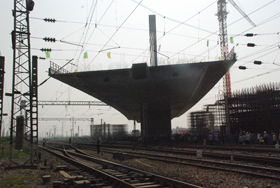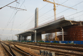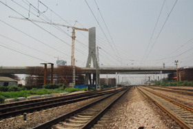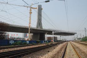 河北省第一座公路轉體斜拉橋,其轉體重量及轉體角度均居世界同類橋梁領先水平。該橋主橋為45+85+85+45米四跨連續獨塔單索面預應力混凝土部分斜拉橋,橋面全寬33m,橋面整幅布置。主橋結構采用墩、塔、梁固結體系,設8對斜拉索。該橋轉體長度為71+71m,轉體角度為75.74,轉體重量為16200t。