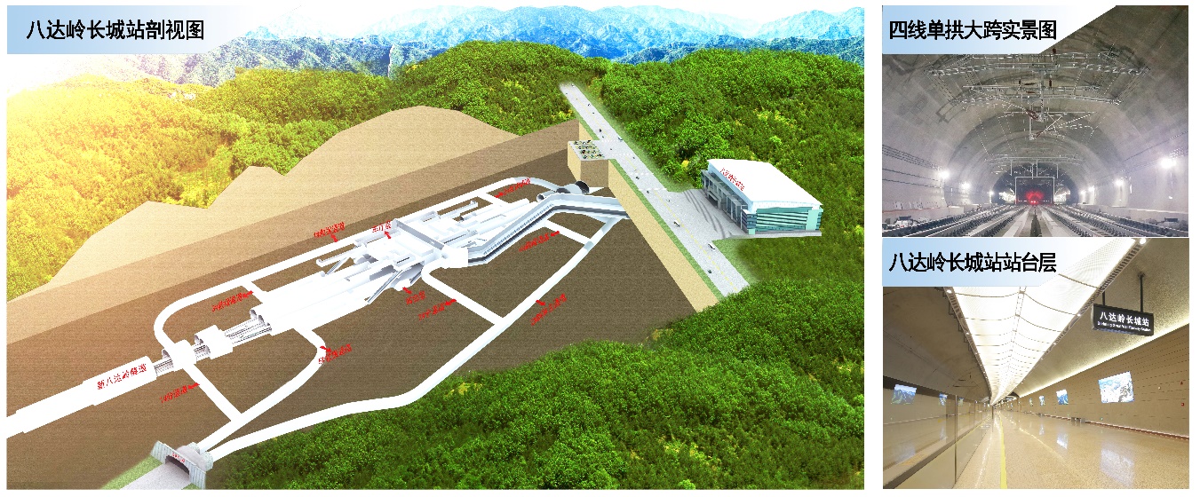 八達嶺長城隧道地處八達嶺核心風(fēng)景區(qū),全長12公里。八達嶺長城站設(shè)在新八達嶺隧道內(nèi),車站為三層三縱結(jié)構(gòu)的復(fù)雜洞室群地下車站,相鄰洞室最小水平間距2.2米、最小垂直間距4.5米,最大埋深102米,站隧過渡段為超大跨結(jié)構(gòu),最大跨度32.7米,地下部分建筑面積4萬平方米。中鐵設(shè)計研發(fā)了超大跨松散圍巖隧道修建技術(shù),解決了深埋地下站防災(zāi)救援疏散、舒適環(huán)境構(gòu)建、小凈距洞群穩(wěn)定及超長耐久性等系列難題,實現(xiàn)了世界上埋深最深、規(guī)模最大的全暗挖站隧一體高鐵車站。