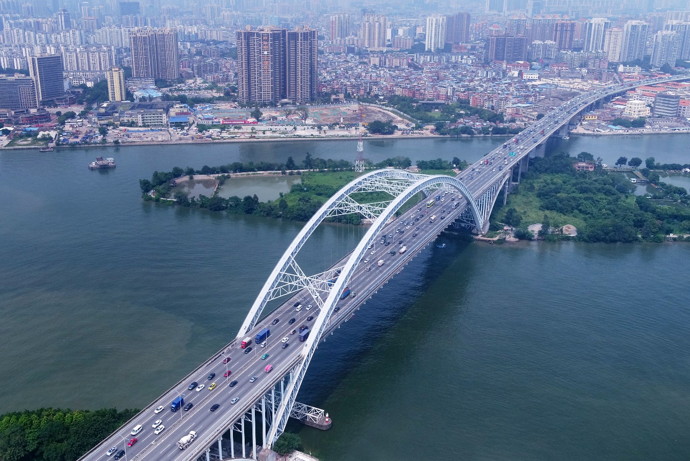 廣州市丫髻沙大橋,位于廣州市主城區西南部,跨越珠江主、副航道和丫髻沙島,全長1084米。主橋采用(76+360+76)米三跨連續自錨式鋼管混凝土拱橋,跨越副航道采用(86+160+86)米三跨連續預應力混凝土剛構橋,全橋橫向布置雙向六車道,20006月建成。
