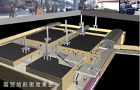 本站是北京地鐵10號線和1號線的換乘站,位處長安街和東三環路交叉口北側,沿東三環國貿橋下設置,為全地下分離式雙層島式站臺車站,單側站臺寬度8.25m,有效站臺長度120m,站內線間距為77.85~80.81m,車站單側洞寬14.4m,結構總長131.2m,主體建筑面積9966m2。車站主體的兩個主洞、橫向聯絡通道、風道和出入口通道均采用礦山法施工,其中主洞和風道施工工法為洞樁法。本站涉及國貿橋120多根橋樁和眾多管線的保護。工程已建成通車。