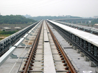 在設(shè)計(jì)工作中,中鐵咨詢集團(tuán)設(shè)計(jì)人員根據(jù)直線電機(jī)牽引系統(tǒng)的特點(diǎn),在國內(nèi)城鐵高架線上首次采用了預(yù)制道床板、砂漿填充墊層的高架橋板式軌道技術(shù)。本結(jié)構(gòu)方案特點(diǎn)是,結(jié)構(gòu)整體強(qiáng)、穩(wěn)定性好,軌道施工質(zhì)量高,便于感應(yīng)板、三軌和鋼軌的精確定位;與其它工法相比,在高架線路上施工作業(yè)空間大,方便各工序的交叉作業(yè)流程,施工效率比較高。